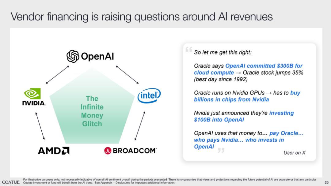市场对于 AI 持续性的另外一个 concern 在于下半年以来的 AI 企业的融资模式呈现出 “循环融资” 的特征。以 OpenAI、英伟达、甲骨文、英特尔等企业之间的资本流动为例,形成了 “OpenAI 承诺向甲骨文支付云服务费用→甲骨文股价大涨→甲骨文依赖英伟达 GPU 需向其采购数十亿美元芯片→英伟达宣布向 OpenAI 投资 1000 亿美元→OpenAI 再用这笔资金支付甲骨文费用” 的循环,这种资金闭环让投资者质疑 AI 企业收入的真实性与可持续性,担忧其如同 “无限资金 glitch”,缺乏实际业务支撑。