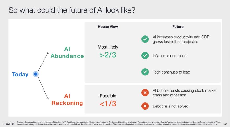 •超 2/3 概率会走向 “AI Abundance:AI 推动生产力提升、GDP 增速超预期,同时通胀可控、科技板块持续引领增长;