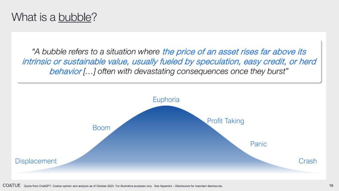 讨论“AI 泡沫”的一个前提是对于“泡沫是什么”有认知共识,因此 Coatue 也在报告中对“泡沫”本身进行了理解分析。