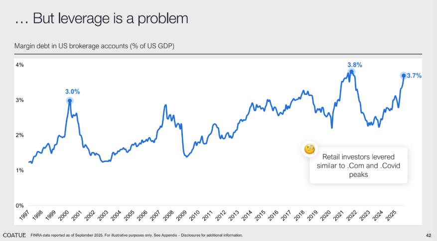 但在杠杆层面,美国经纪账户的保证金债务占 GDP 比例已达 3.7%,接近互联网泡沫(3.0%)和 Covid 峰值(3.8%)时的水平,散户投资者的杠杆操作已与历史泡沫期相似,这一现象为市场埋下了潜在风险。