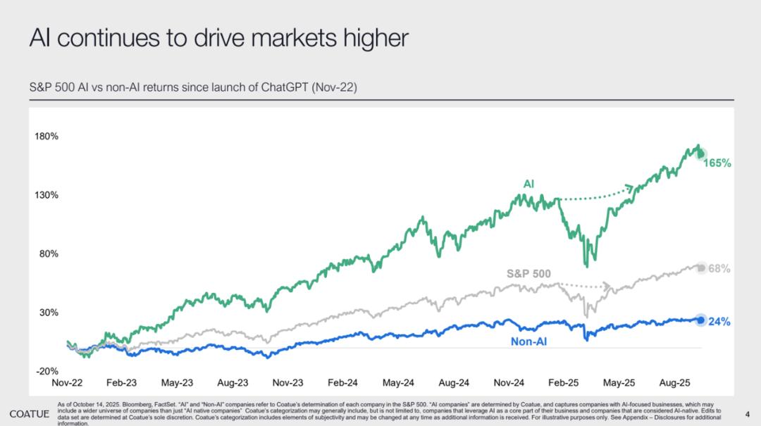 在一开始,Coatue 对于当下普遍在争论的“AI 泡沫论”给出了鲜明的否定态度。Coatue 结合二级市场宏观表现与终端消费者数据,明确了 AI 对经济已经产生实际拉动作用,而非单纯的投机炒作。以 OpenAI 为代表的 AI 公司是当下股市的核心驱动力,二级市场的 AI winners 叙事也正从 Mag 7 向细分领域头部公司扩散。
