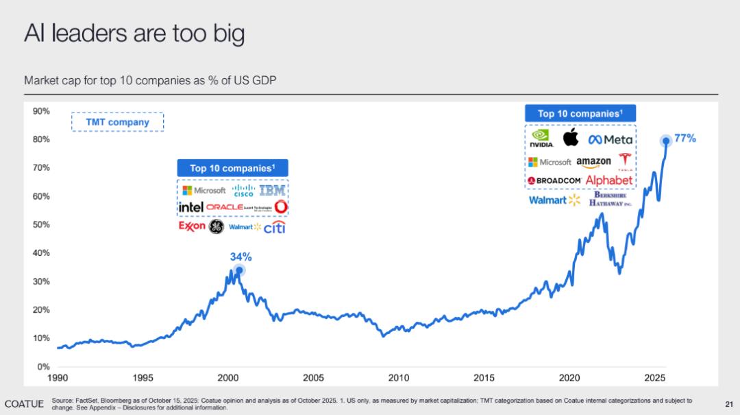 2025 年,美国前 10 大公司市值占 GDP 比例为 77%,且 10 家公司中有 8 个都是 TMT 公司。反观 2000 年互联网泡沫高点,前 10 大公司市值占 GDP 比例仅 34%,且 TMT 公司仅 6 家。这一数据对比似乎强化了 “市场过度集中、存在泡沫风险” 的疑虑。
