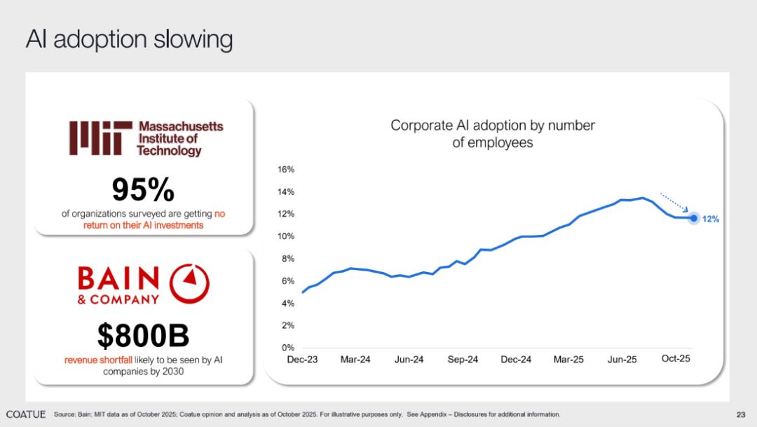从企业应用端看,MIT 的调研显示,95% 的受访机构在 AI 投资上未能获得回报;贝恩公司则预测,到 2030 年 AI 企业可能面临 8000 亿美元的收入缺口。同时,企业 AI 采用率(按员工数量统计)在 2025 年 10 月已回落至 12%,呈现出 “AI 采用放缓” 的态势,这些数据似乎暗示 AI 的实际价值与市场预期存在差距。