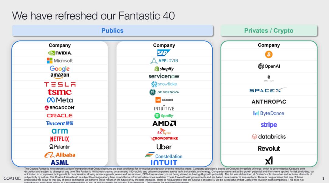 •Coatue 早前发布的“Fantastic 40”指数中并未纳入 Google,但随着 Google AI 叙述反转,Coatue 在这次报告中也修正了自己的“错误”,重新将 Google 纳入其中;