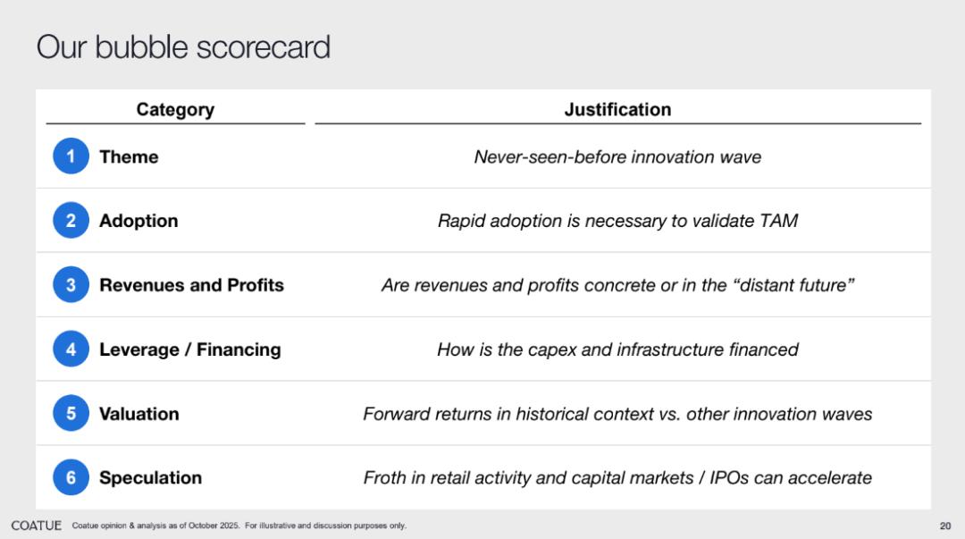 Coatue 还推出了 “泡沫评分标准”,用于评估一个产业是否正处于或接近泡沫阶段,这一框架将泡沫的形成归结为六个关键维度:“主题的创新程度”、“市场普及性”、“收入利润真实性”、“杠杆融资方式”、“估值的历史对比”以及“投机狂热程度”: