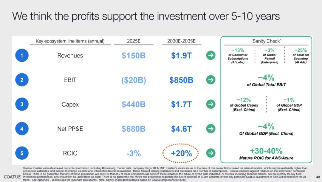 Coaute 估算,到 2025 年 AI 生态年收入预计达 1500 亿美元,今天处于投入期,所以 2025 年 AI 生态 EBIT 为 -200 亿美元,但到 2030-2035 年将实现爆发式增长:年收入飙升至 1.9 万亿美元,EBIT 达 8500 亿美元,投资资本回报率(ROIC)也将从 -3%跃升至 +20%,20% 是接近 AWS、Azure 等成熟云服务的 ROIC 水平。