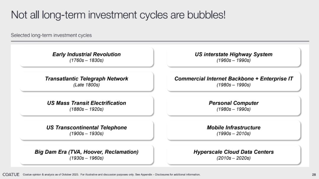 Coatue 认为,今天的 AI 投资热潮在特征上最接近“股票市场”和“基础设施”型泡沫:由技术革新推动,伴随巨额资本投入与高涨预期。