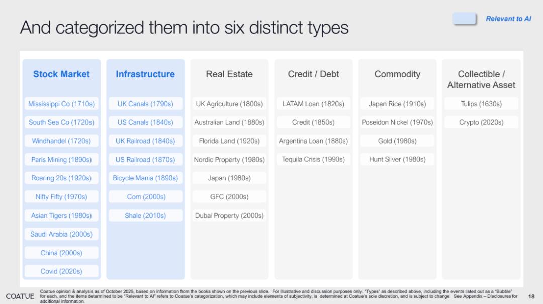虽然泡沫形式多样,但它们往往遵循相似的情绪与资本循环,从资产类型来看,泡沫又可以被分为 6 大类: