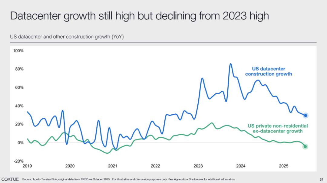 有些市场观点对 AI 基础建设持较负面态度。认为美国数据中心建设增速从 2023 年高点回落,呈现出 “增长放缓” 的态势,由此对 AI 基础设施的长期前景产生疑虑,担忧这种放缓可能预示着 AI 产业的扩张动力不足。