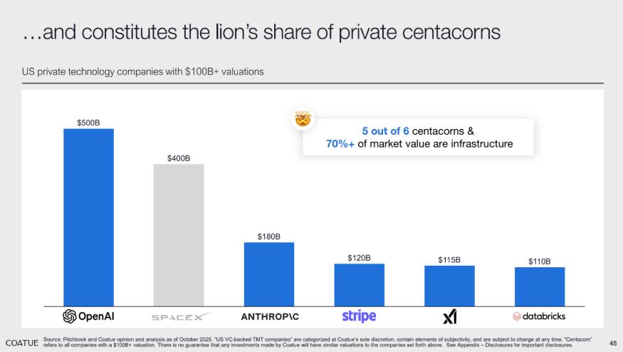 一级市场的价值逻辑同样向基础设施倾斜。在美国估值超 1000 亿美元的未上市科技公司中,5/6 的 “千亿估值企业(centacorns)” 以及超 70% 的市值均来自 AI 基础设施领域,覆盖模型层、数据层等关键环节。其中, OpenAI 以 5000 亿美元断层领先,后续企业则均处于 1000+ 亿美元的市值区间。