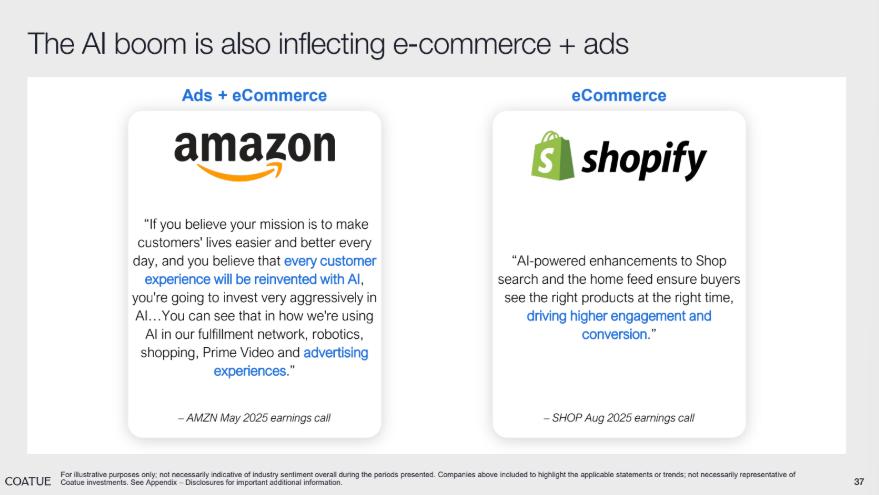 这里 Coatue 以 Amazon、Shopify 为例来说明 AI 已经给企业带来实打实的经济收益。