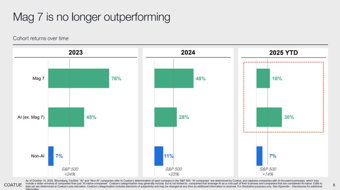 进入到 2025 年,一个相当有趣的变化是,AI 增长已彻底突破Mag7 公司的局限。