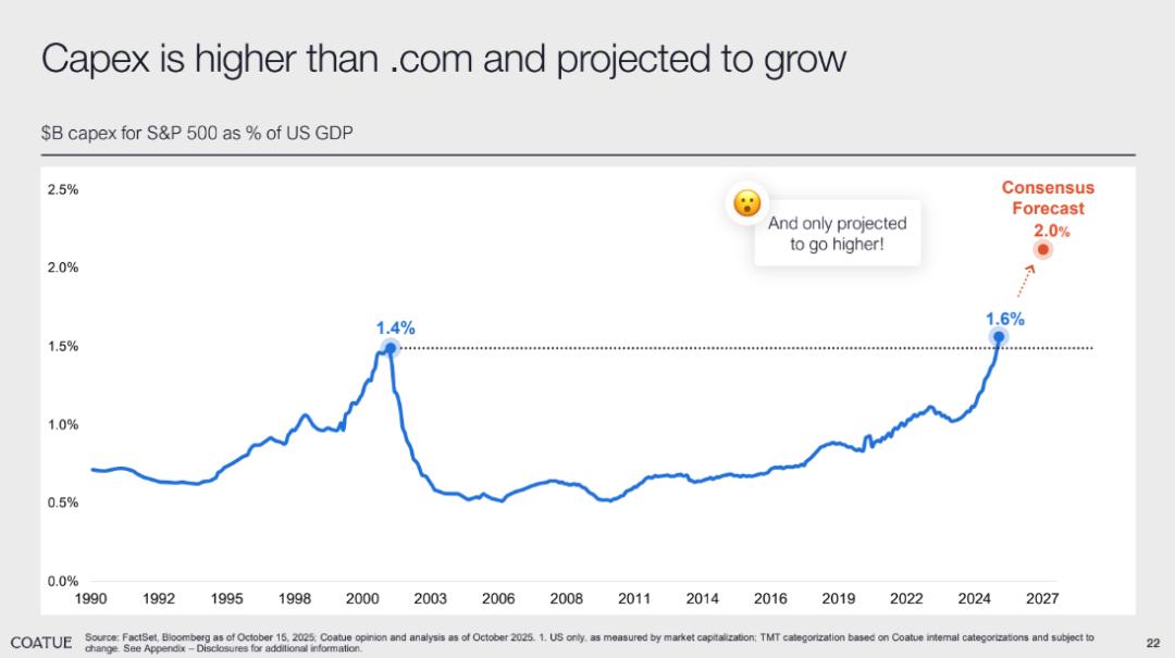 从 CapEx 维度看,S&P 500 公司 CapEx 已经占到了美国 GDP 的 1.6%,且市场共识预计这一比例将进一步提升至 2.0%,这个比例已超过互联网泡沫时期的 1.4%,也因此,市场担忧这种高 CapEx 极有可能引发类似互联网泡沫时期风险。