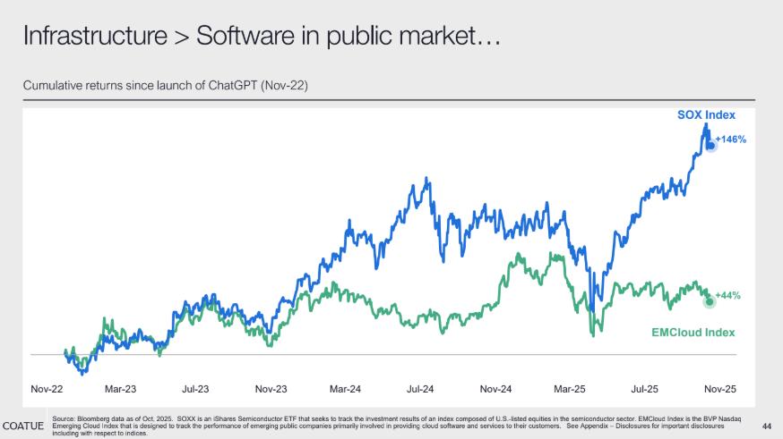 在二级市场,AI 基础设施的表现显著优于软件板块。自 2022 年 11 月 ChatGPT 推出以来,费城半导体指数(SOX Index) 累计回报达 146%,而云软件指数(EMCloud Index)仅为 44%。这一差距清晰表明,半导体等 AI 基础设施是驱动本轮 AI 革命的核心引擎,相较之下软件板块的增长势能明显不足。