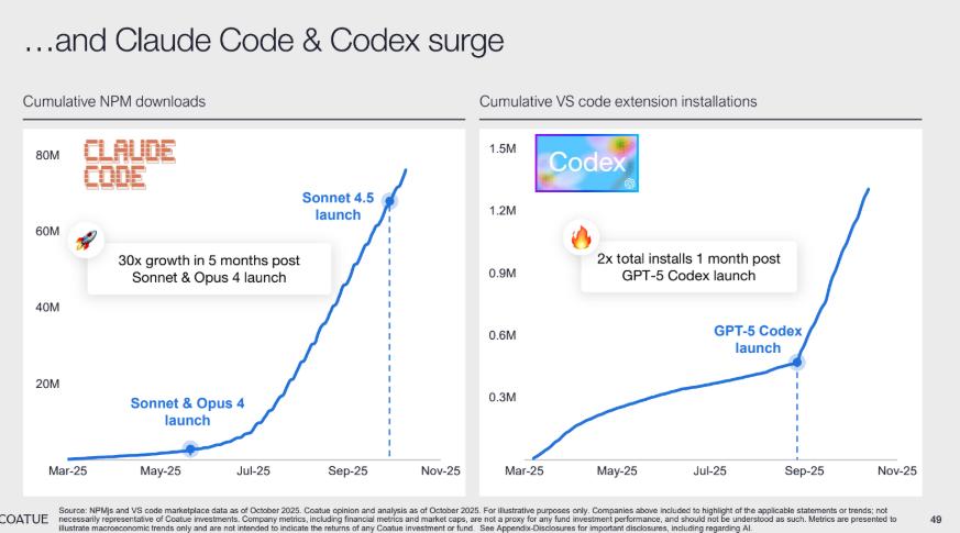 这种能力跃迁在市场接受度上也得到印证:Claude Code 的 NPM 下载量在 Sonnet & Opus 4 发布后 5 个月增长 30 倍,Codex 的 VSCode 扩展安装量在 GPT-5 发布后 1 个月翻倍,应用层的生产力爆发直接受益于底层模型的前期投入。