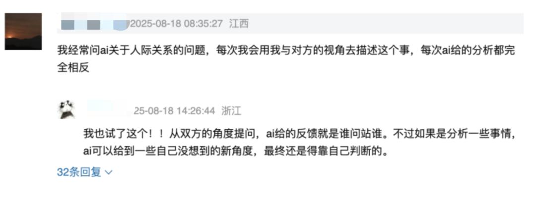 同一个AI可能会对一方说:“你需要警惕这段关系中的情感操纵”,转而告诉被指认的操纵者“你只是在维护合理的个人边界”。