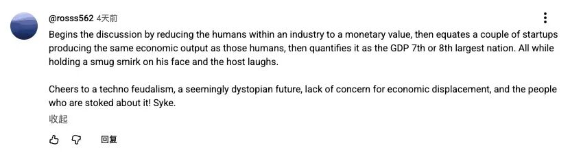 他一开始就把一个行业里的人贬低成了金钱价值,然后用几家初创公司创造的经济产出,来与这些人(的产出)划等号,接着再把这个数值量化成全球 GDP 排名第七或第八大国家的体量。整个过程中,他脸上挂着沾沾自喜的笑容,主持人也在一旁大笑。向“技术封建主义”致敬吧——一个看似反乌托邦的未来,对经济替代毫不在意,却还有人为此兴奋不已!真是讽刺。