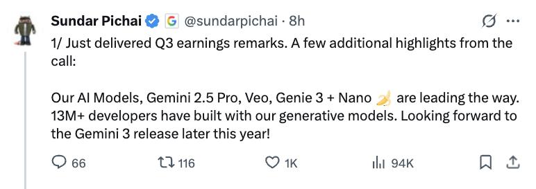 皮查伊在讲话中提到:“超过1300万开发者已使用我们的生成模型进行开发”,并预告了将在今年晚些时候发布Gemini 3,表明谷歌正通过技术迭代和生态建设巩固AI领先地位。