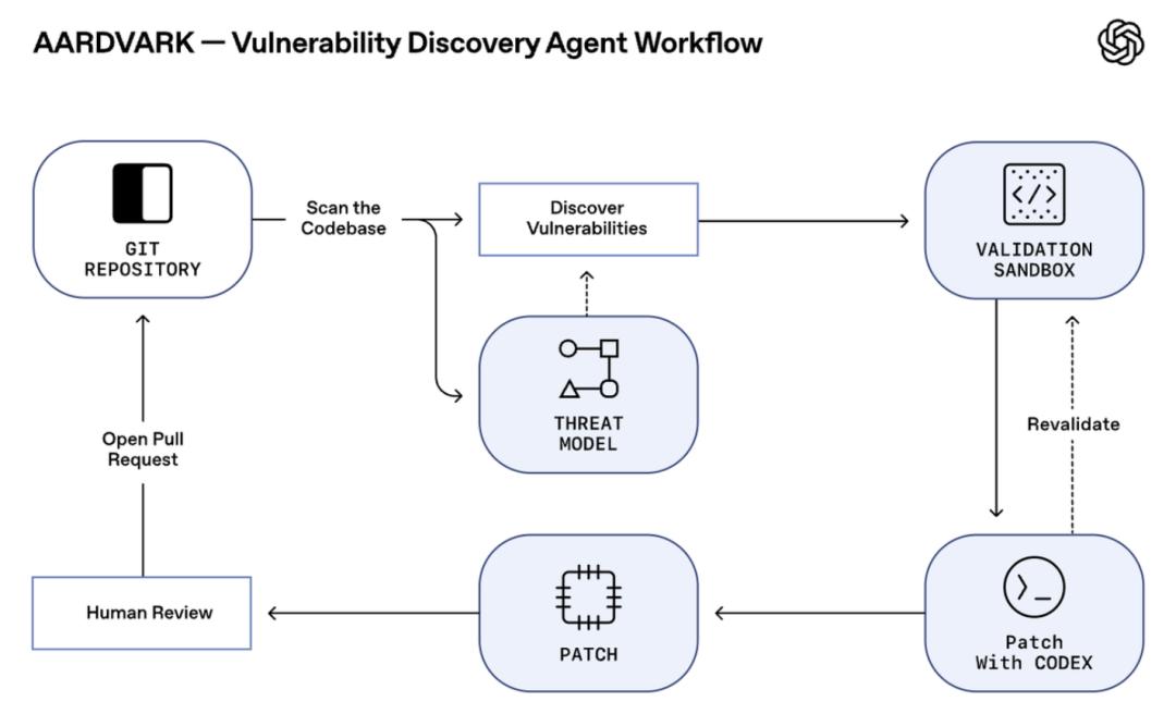 具体来说,它的工作流程从Git仓库出发,依次经历:威胁建模→漏洞发现→沙盒验证→Codex 修复→人工复审→ 提交Pull Request。