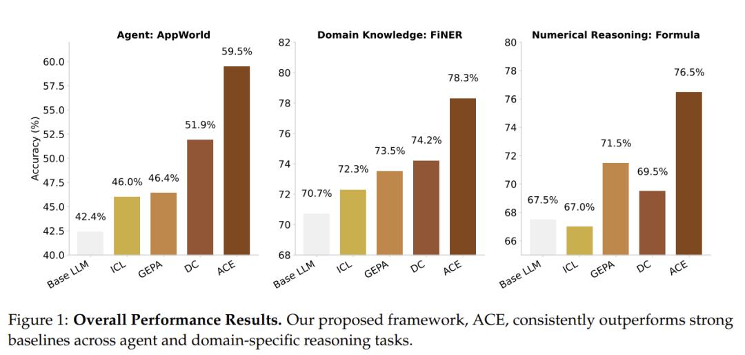 图注:ACE 框架在三类任务(智能体操作、领域知识、数值推理)上都显著优于其他方法,准确率提升最明显。