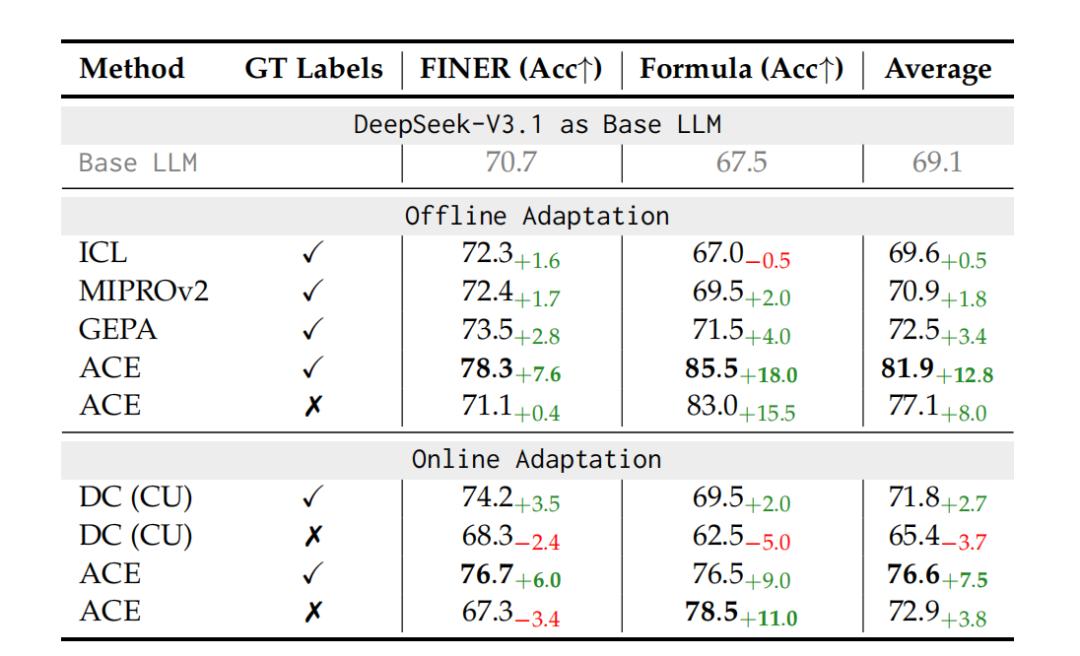 在复杂的AppWorld代理任务中,ACE框架带来了+10.6%的平均性能提升,并将适应延迟降低86.9%。