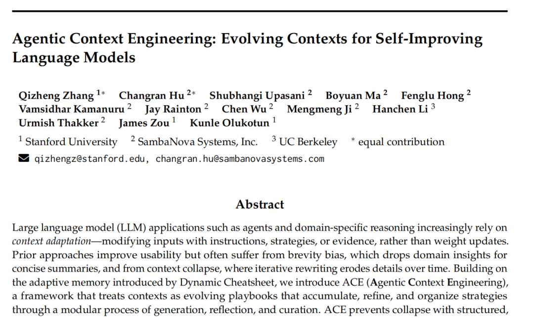 近日,斯坦福大学与 SambaNova Systems 合作发表了论文《Agentic Context Engineering: Evolving Contexts for Self-Improving Language Models》。