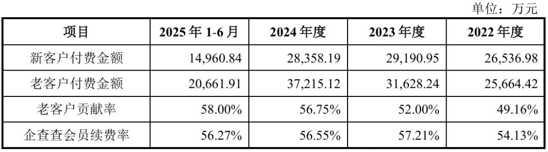 从贡献率来看,企查查多亏了老客户的支持,老客户贡献率从2022年的49.16%涨至2025年6月末的58%。