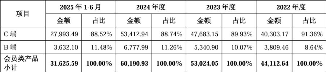 其营收结构较为单一,报告期内,会员类产品收入占总营收比重,分别为85.09%、85.77%、84.98%、84.25%。