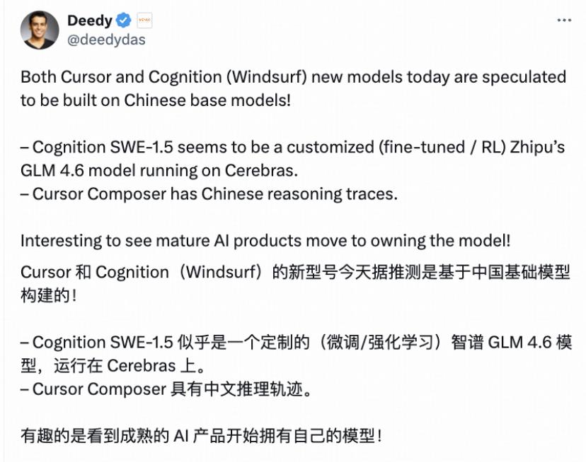 最近,美国最早跑出 PMF 的编程工具 Cursor 和 Windsurf 纷纷推出了自有模型 Composer 和 SWE-1.5。随后,两家模型均被证实采用中国大模型。