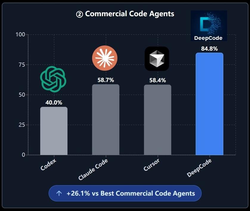 DeepCode得分84.8% ,领先Claude Code(58.7%)约26.1个百分点。