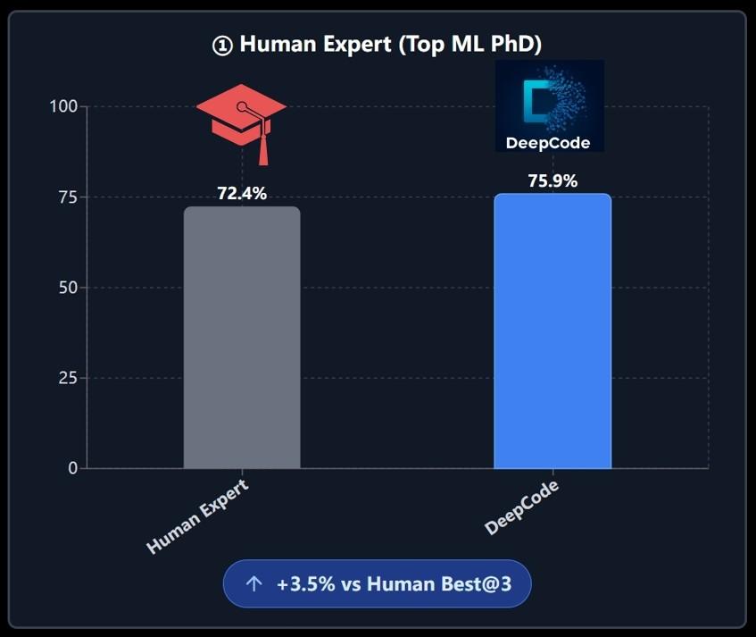 在OpenAI发布的PaperBench基准测试中,DeepCode的总体准确率为75.9%,超过参与评测的人类专家组72.4%的成绩。