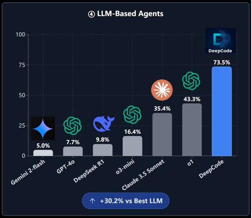 与性能最佳的大模型智能体(43.3%)相比,DeepCode(73.5%)提升了30.2个百分点。