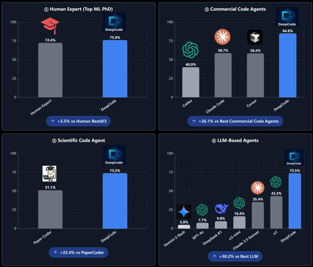 在基准测试中,DeepCode在复现成功率和代码质量方面表现出众,在多项指标上超过了顶级大学的机器学习博士。