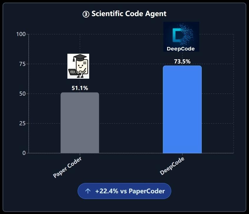 与目前最先进的科学代码复现框架PaperCoder(51.1%)相比,DeepCode的复现率达到了73.5% ,提升了22.4个百分点。