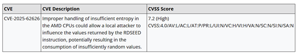 该缺陷会导致随机产生的数值错误地变成“0”,大幅降低系统的机密性和安全性,漏洞编号为CVE-2025-62626,CVSS评分7.2,被评估为“高严重性”。