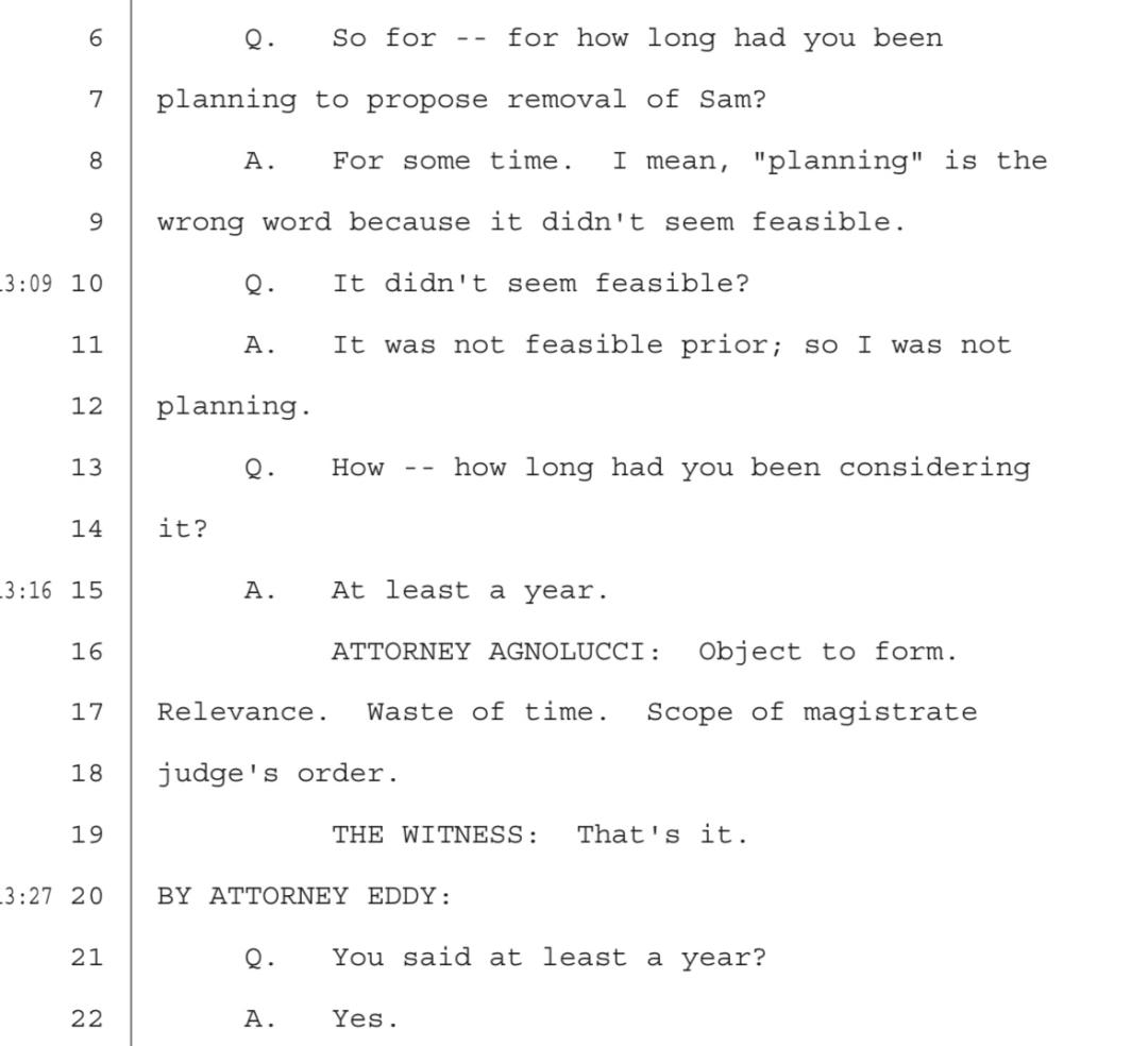 问(文章都是指代律师,下同):那么——你筹划提出撤除Sam的计划有多长时间了?
