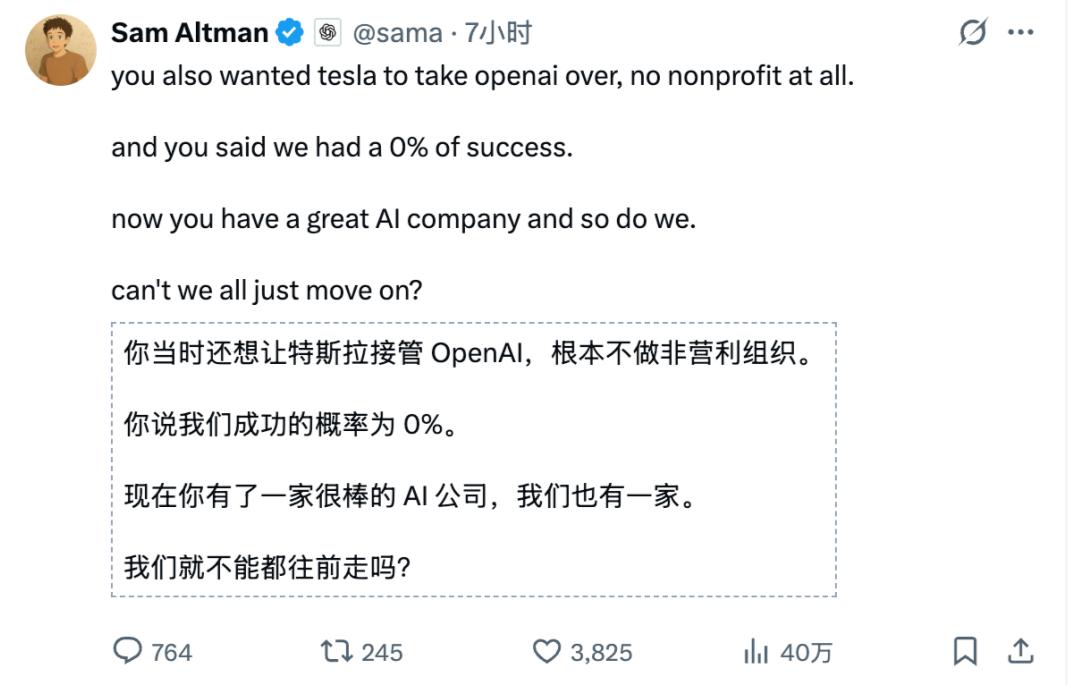 毕竟说起来,当年OpenAI是奥特曼找到马斯克,两人一拍即合创造的公司。