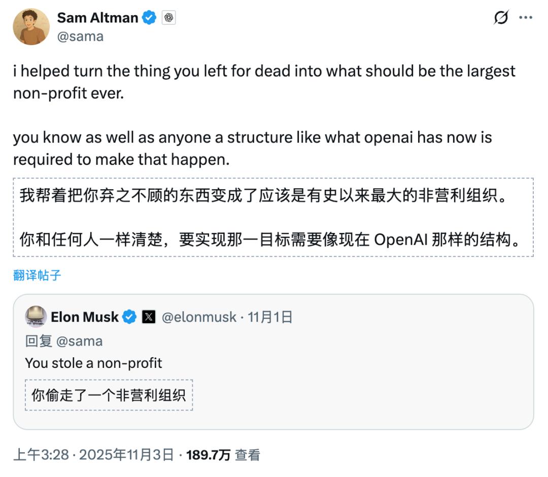 奥特曼说,是他把马斯克「弃之不顾」的OpenAI打造成了有史以来最大的非盈利组织。