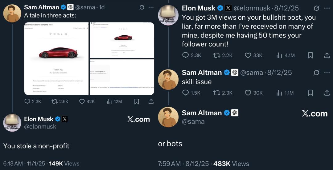 马斯克说,奥特曼你的那条胡扯帖子居然有300万浏览,骗子!