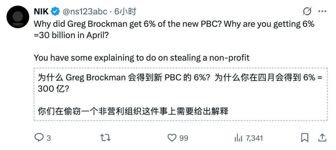 说白了,PBC是赚钱的,但是奥特曼和Greg都拥有PBC的股份,这对于估值达到5000亿美元的OpenAI来说,并不是小数目。