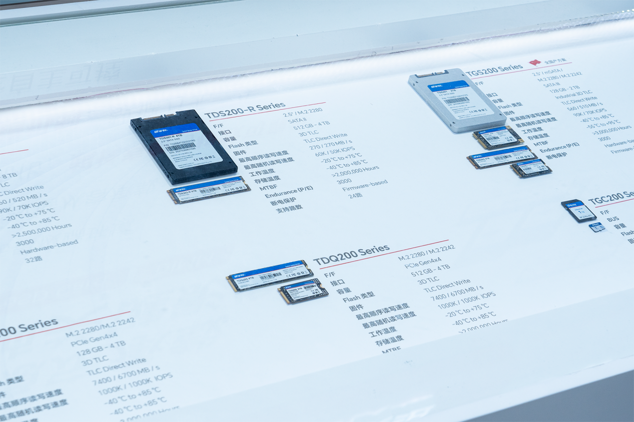 呈现了视频监控 TDS200-R、TDC 200 存储模组产品系列和工业级eMMC、DDR、LPDDR、BGA SSD 等嵌入式存储系列产品。