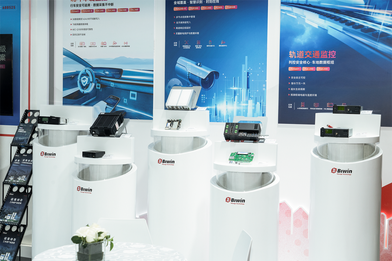 在应用场景演示区,佰维围绕“车载终端”、“智慧城市/园区安防”与“轨道交通”三大典型场景,结合展板与样机演示,系统呈现了存储产品在复杂环境下的稳定表现与定制化能力。