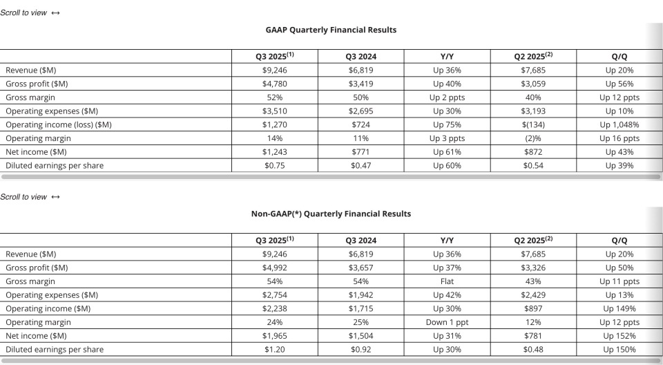 营收为92.46亿美元,超出华尔街分析师平均预计的87.4亿美元,相比之下上一财季为76.85亿美元,环比增长20%;去年同期为68.19亿美元,同比增长36%。
