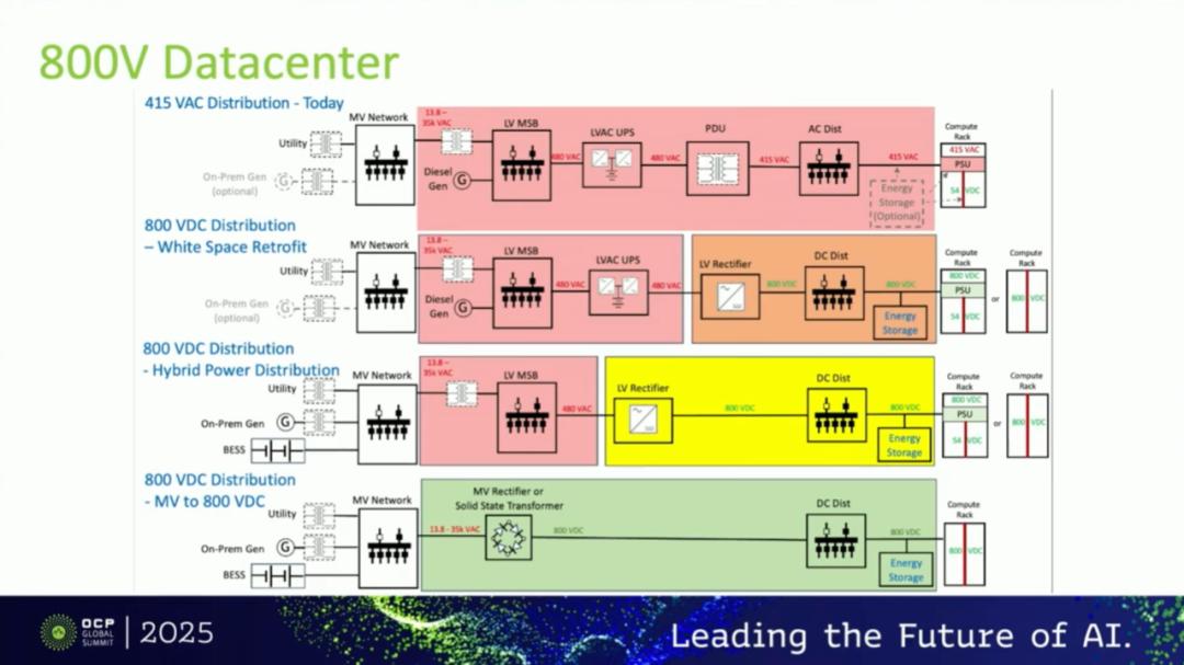 我们先退一步来说,整个电是怎么产生的?高压电线如果是跨距离传输,是350千伏的这样一个体量;到本地的一个变电站,大概是3.8到35千伏中压的电;它到数据中心之内,可能通过一个不间断的power supply(UPS)传到数据中心里面,目前来说一般是480伏或者415伏交流电,再通过一个交流转直流,把它转换成54伏去给所有的芯片或者服务器去供电。
