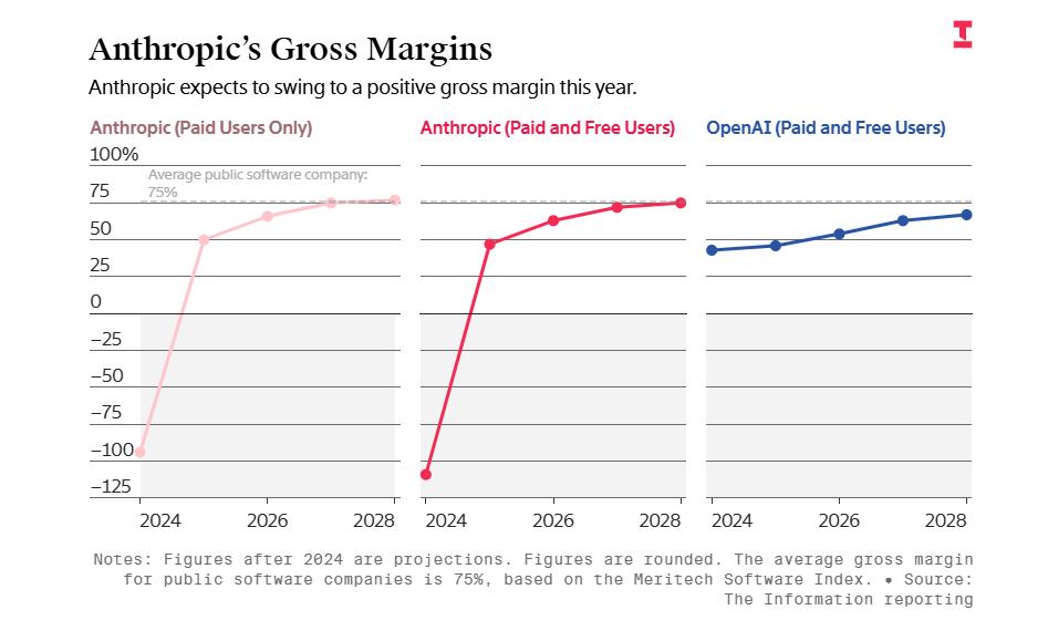 但需注意,Anthropic的计算仅包含付费用户的服务成本。若参照OpenAI的统计方法(包含免费用户成本),其毛利率数据将会下调:去年为-109%,今年预计47%,2028年预计75%。不过,这一水平仍接近高效企业软件公司70%以上的毛利率标准。