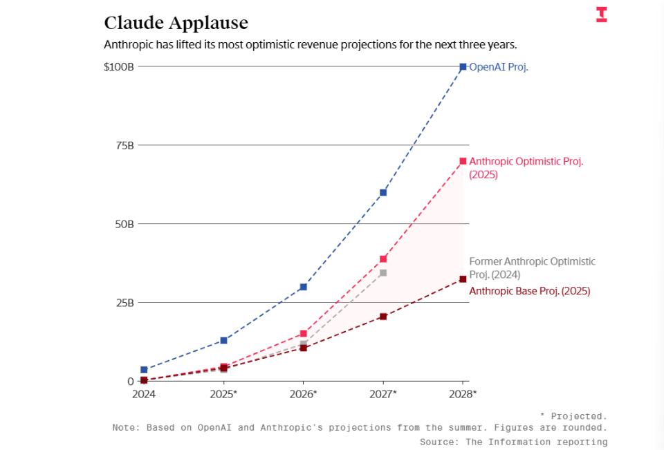 在最新预测中,Anthropic将2025年营收预期上调26%至47亿美元,2026年预期上调28%至152亿美元,2027年预期上调13%至389亿美元。相比去年3.81亿美元的实际营收,这一增长曲线极为陡峭。