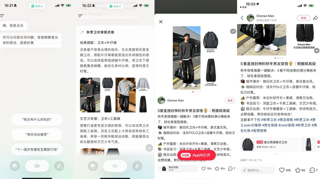 而在“点点”App中,界面和一般AI大模型产品类似,都是对话模式,但AI提供的结果中涉及到生活种草场景时,可直接点击后跳转回小红书App,并直达商品下单界面。