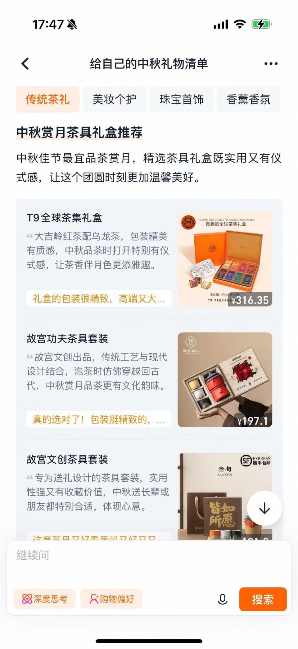 比如,有人尝试在“AI万能”搜中输入:“给自己的中秋礼物清单”,结果AI给到的结果包含四大类,十多种商品。AI并没有太理解用户的个性化偏好,而更像是在中秋背景下的“大众偏好”,给到了茶礼相关的推荐。
