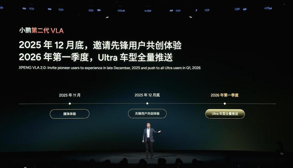 关于推送计划,小鹏自动驾驶升级近期暂缓,正全力切换VLA。本月(11月)将开放媒体试驾,12月底开放先锋用户共创体验。2026年一季度在Ultra车型全量推送。