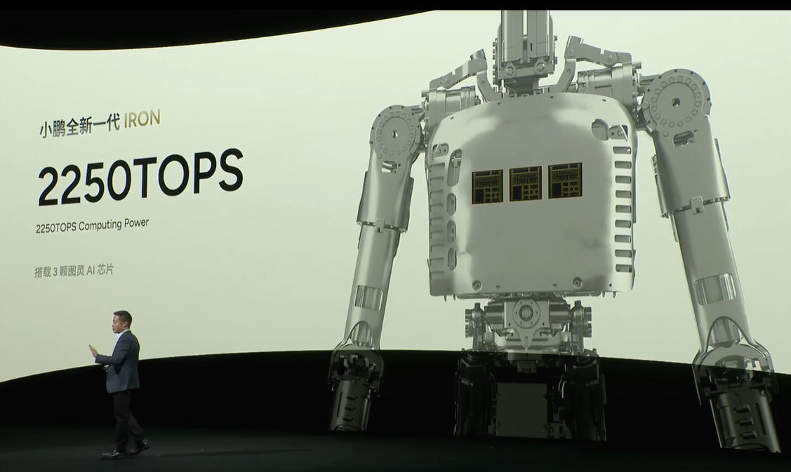 据现场介绍,这款新一代IRON机器人采用了82个自由度的设计,并配备了全固态电池与仿生脊柱技术。在核心算力方面,其搭载的3颗图灵AI芯片可提供高达2250 TOPS的总算力。
